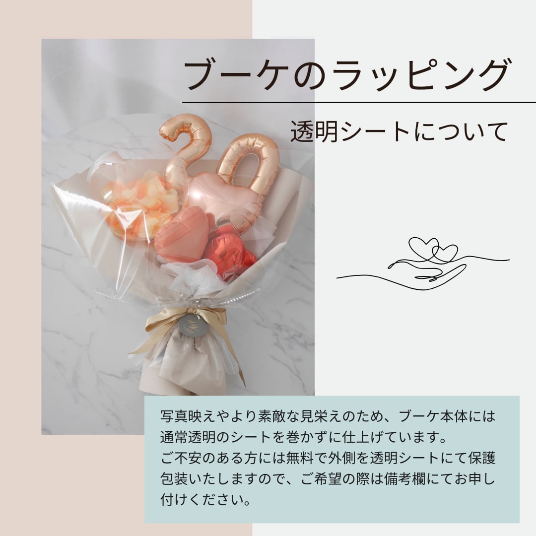 ※お写真撮影の見栄えのため、基本的にはバルーンブーケは透明OPPシートでお包みしておりませんが、ご希望がありましたらお包みいたします。(商品画像参照)