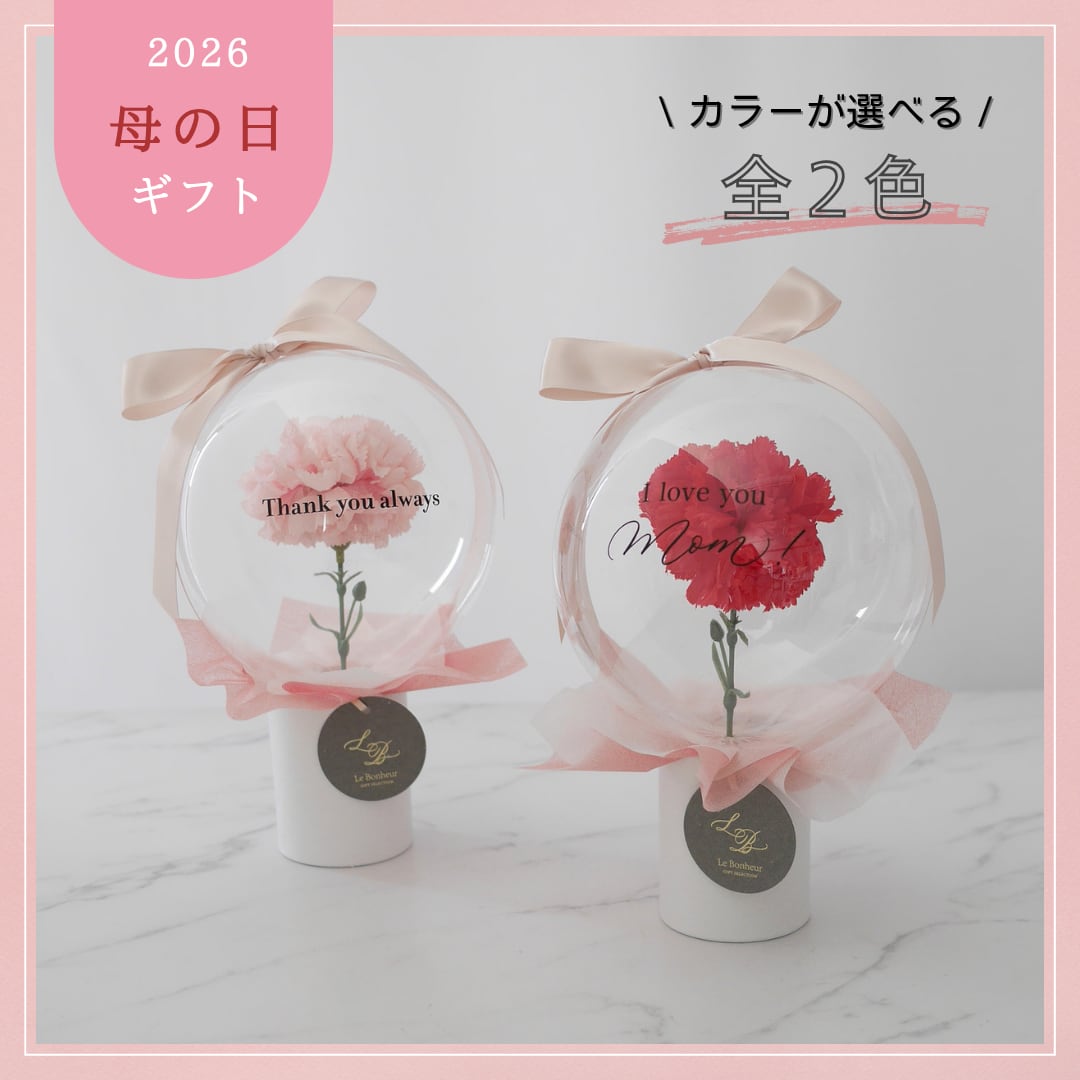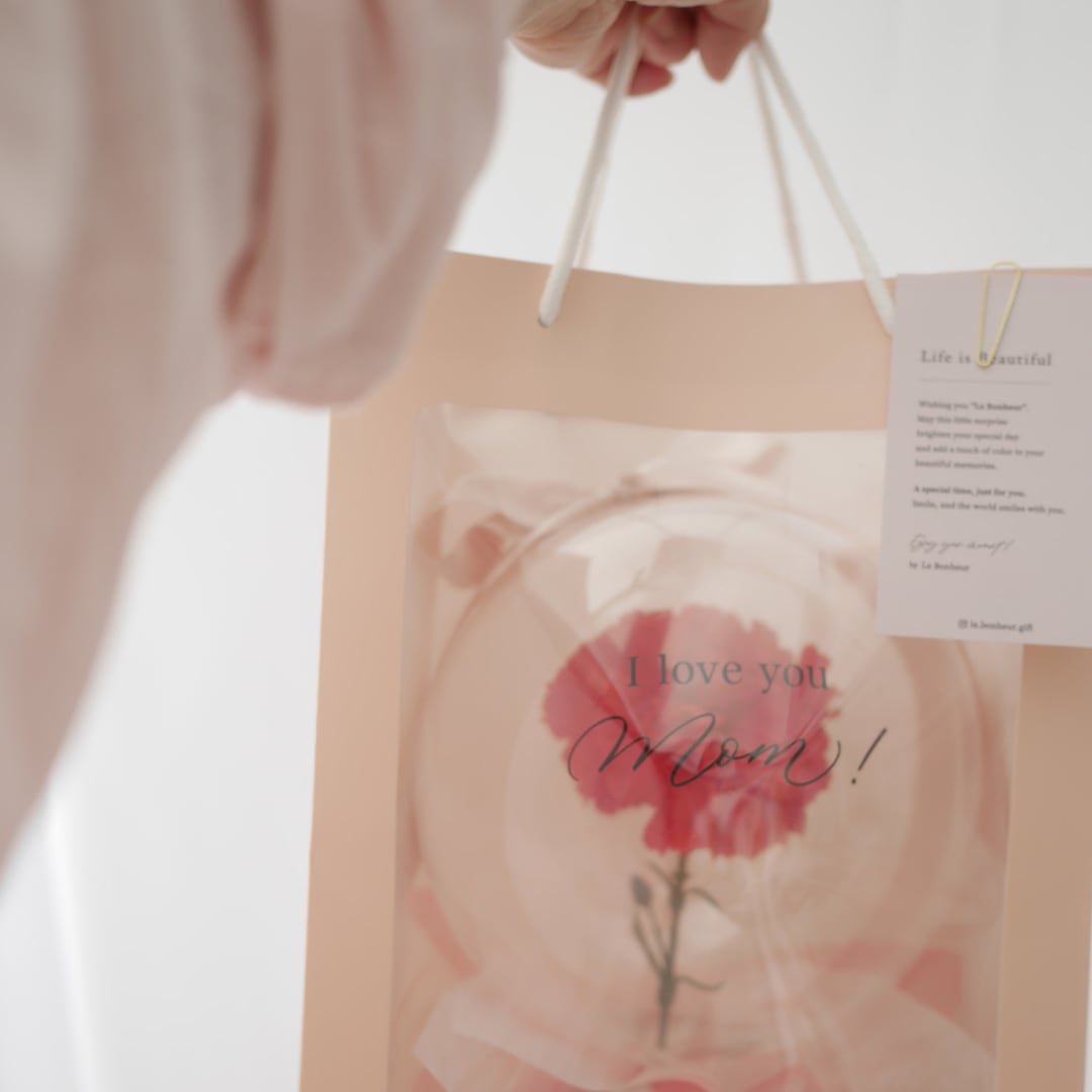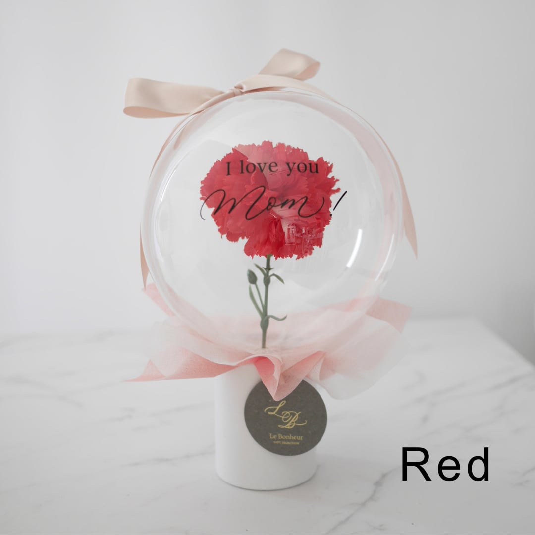 クリアなバルーンの中に一輪のカーネーションを閉じ込めた、コンパクトながらも洗練されたデザイン。持ち歩いている姿も可愛らしく、お菓子やワインなどのギフトにそっと添えて贈る「プラスワン」のアイテムとしてもおすすめです。
