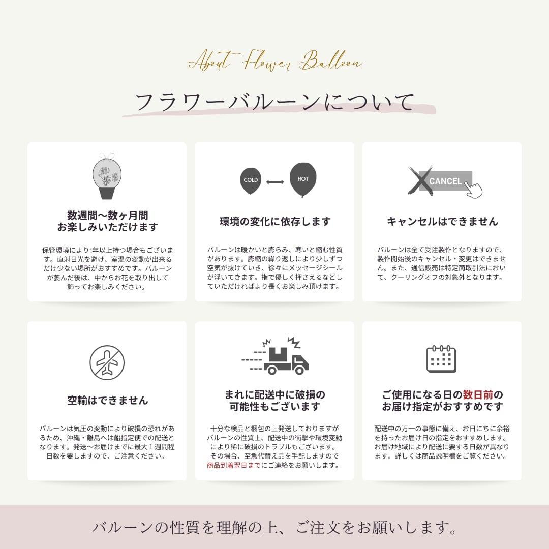 バルーンの性質上、上記をご理解頂いた上でのご注文をお願い致します。