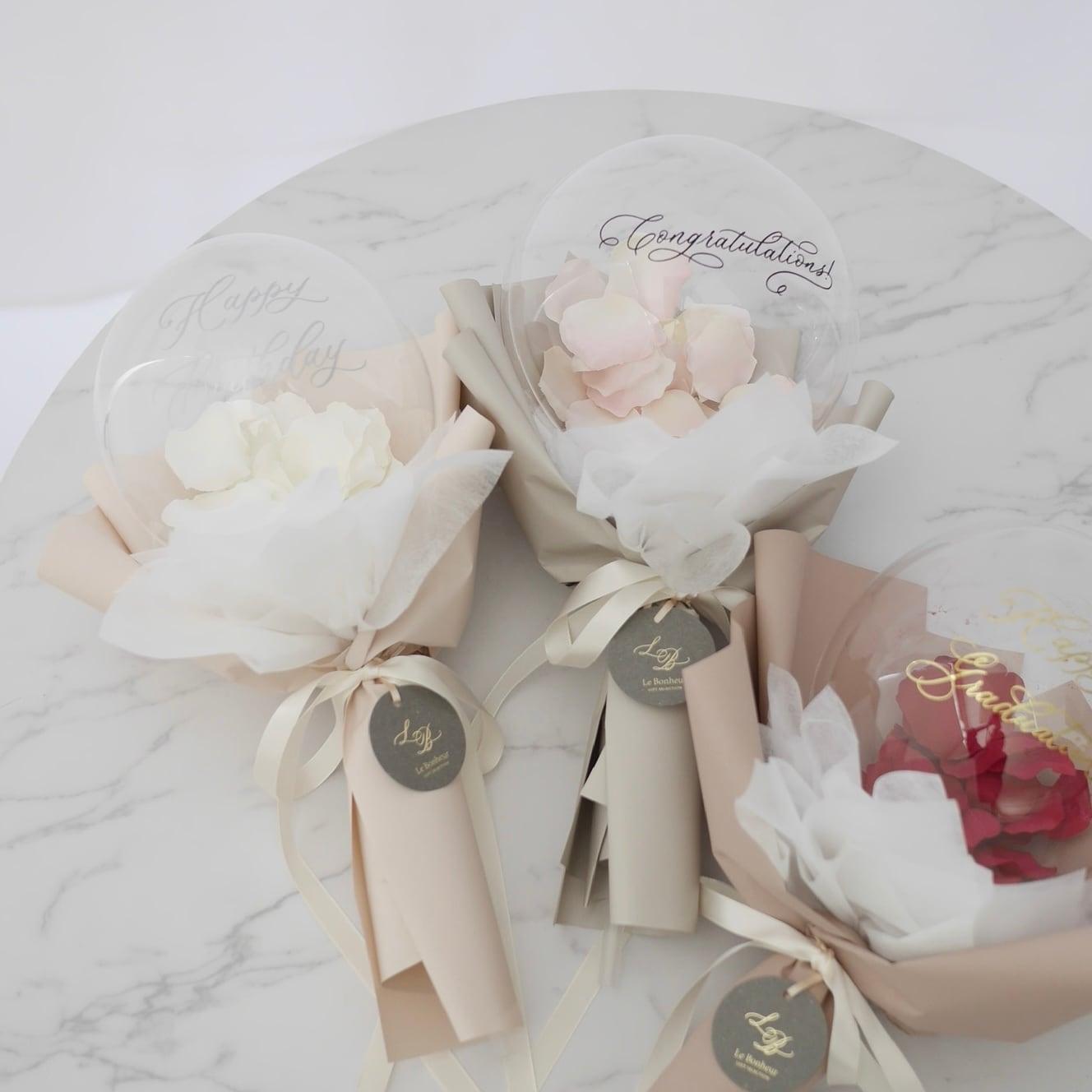 花びらの入ったBOXタイプのバルーンをご希望の場合は、当商品ではなく、『フラワーバルーンブーケ【花びらタイプ】』https://www.lebonheur.gift/items/42823450 をBOXアレンジへ変更オプションと共にご注文下さい。