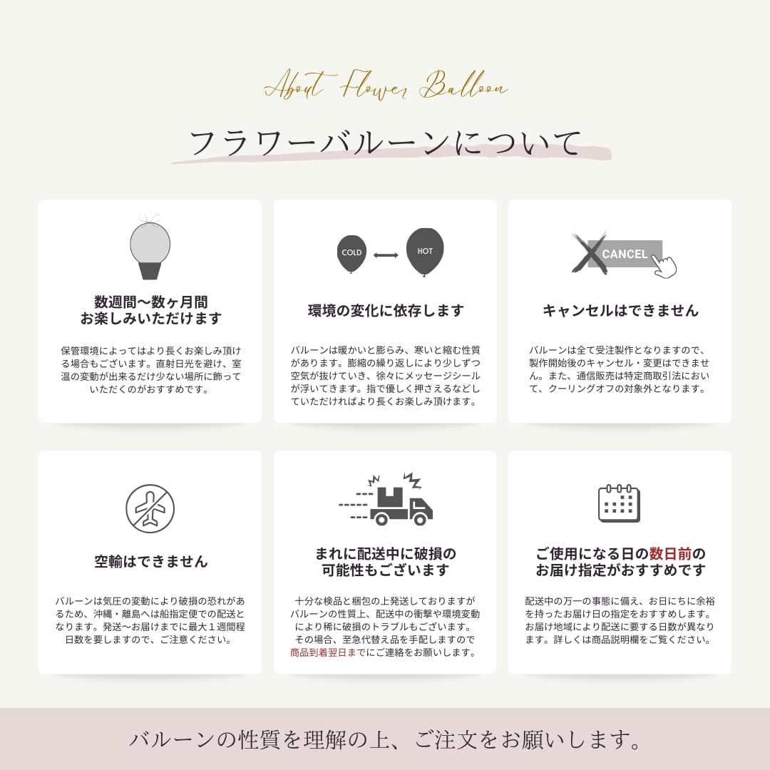 バルーンの性質上、上記をご理解頂いた上でのご注文をお願い致します。